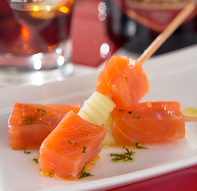 Cortamos el salmón ahumado en dados de aproximadamente 2 cm, lo ensartamos en una brocheta, acompañado de un trocito de apio. Para el aceite de eneldo: En un pequeño bol, añadimos el aceite de oliva virgen extra e incorporamos eneldo fresco picado. Colocamos donde vayamos a servir y regamos con el aceite de eneldo por encima.